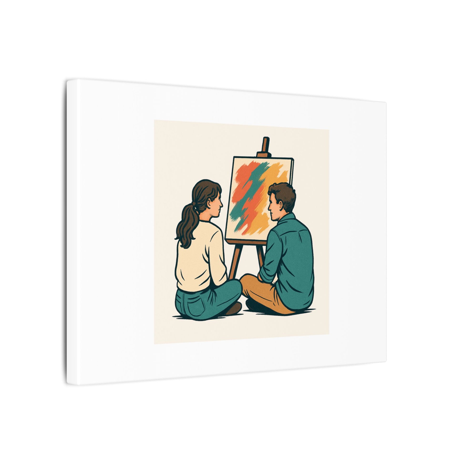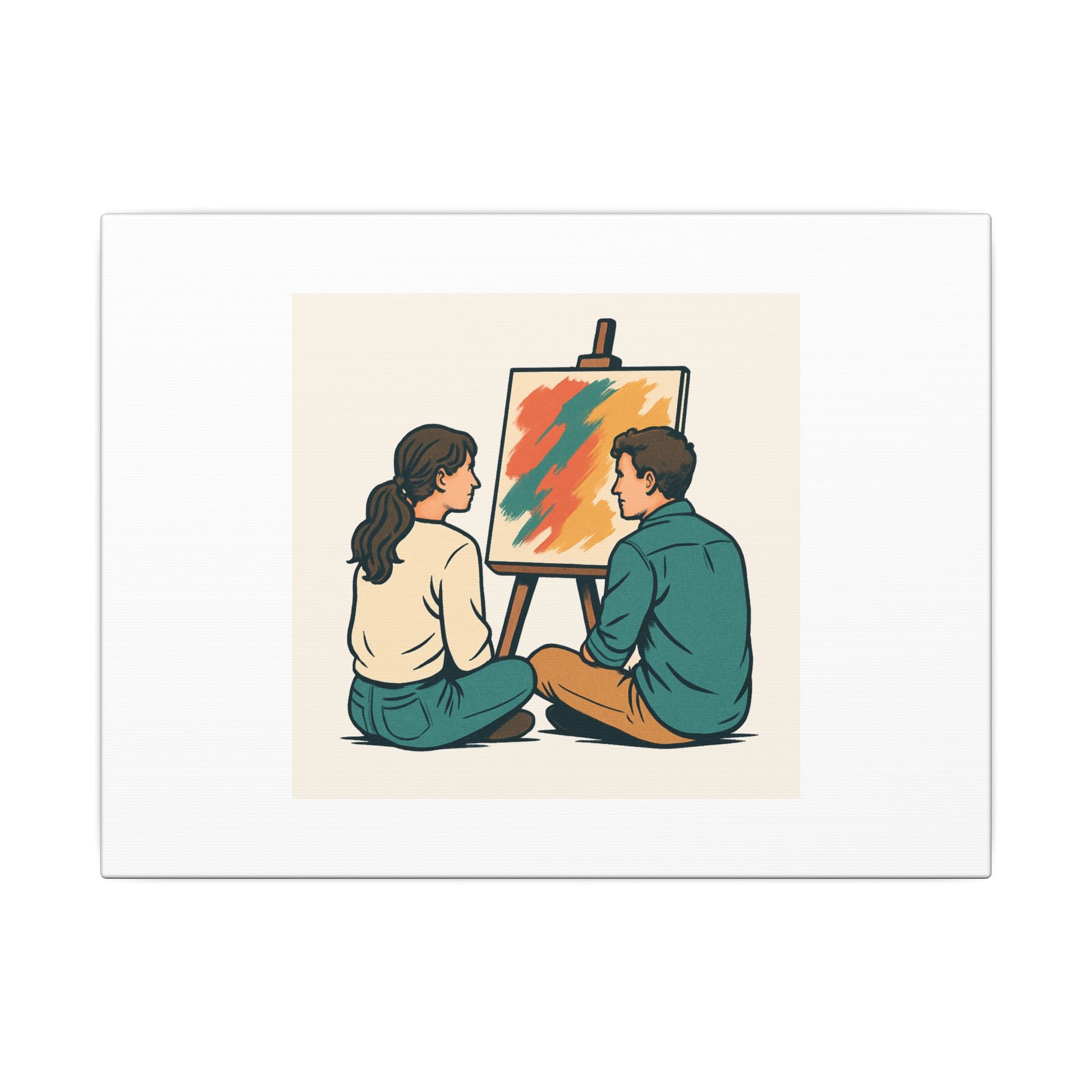 A warm, minimalist stretched canvas that captures a quiet moment between two people sharing creativity. The soft illustration sits on a generous white margin, letting the scene breathe while the matte finish keeps reflections away. Lightweight yet sturdy, the canvas brings a calm, artful presence to living rooms, studios, or reading nooks — a gentle reminder of shared time and quiet collaboration.